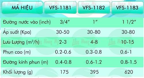 Bộ phun tạo hình cánh hoa nước thẳng thường được sử dụng kết hợp nhiều lại với nhau để tạo nên một bông hoa nước đẹp lung linh. Vòi phun có chiều cao phun thấp từ 0.2 cho đến 1m. Khách hàng có thể lựa chọn chiều cao phun phù hợp theo 3 mã hiệu sau đó là VFS-1181, VFS-1182, VFS1183.